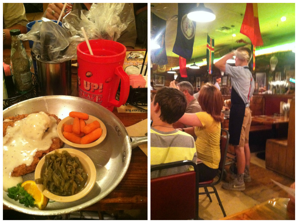 The best meal we had during our four day stay was at Lambert’s which is actually just outside of Branson in the town of Ozark. It’s claim to fame is huge portions of country cooking and waiters that throw rolls at the patrons. Other restaurants around also do the “throw a roll” thing, but no one else’s food was as tasty. I enjoyed my chicken fried steak so much, I posted a copycat recipe on my food blog Yates Yummies.
