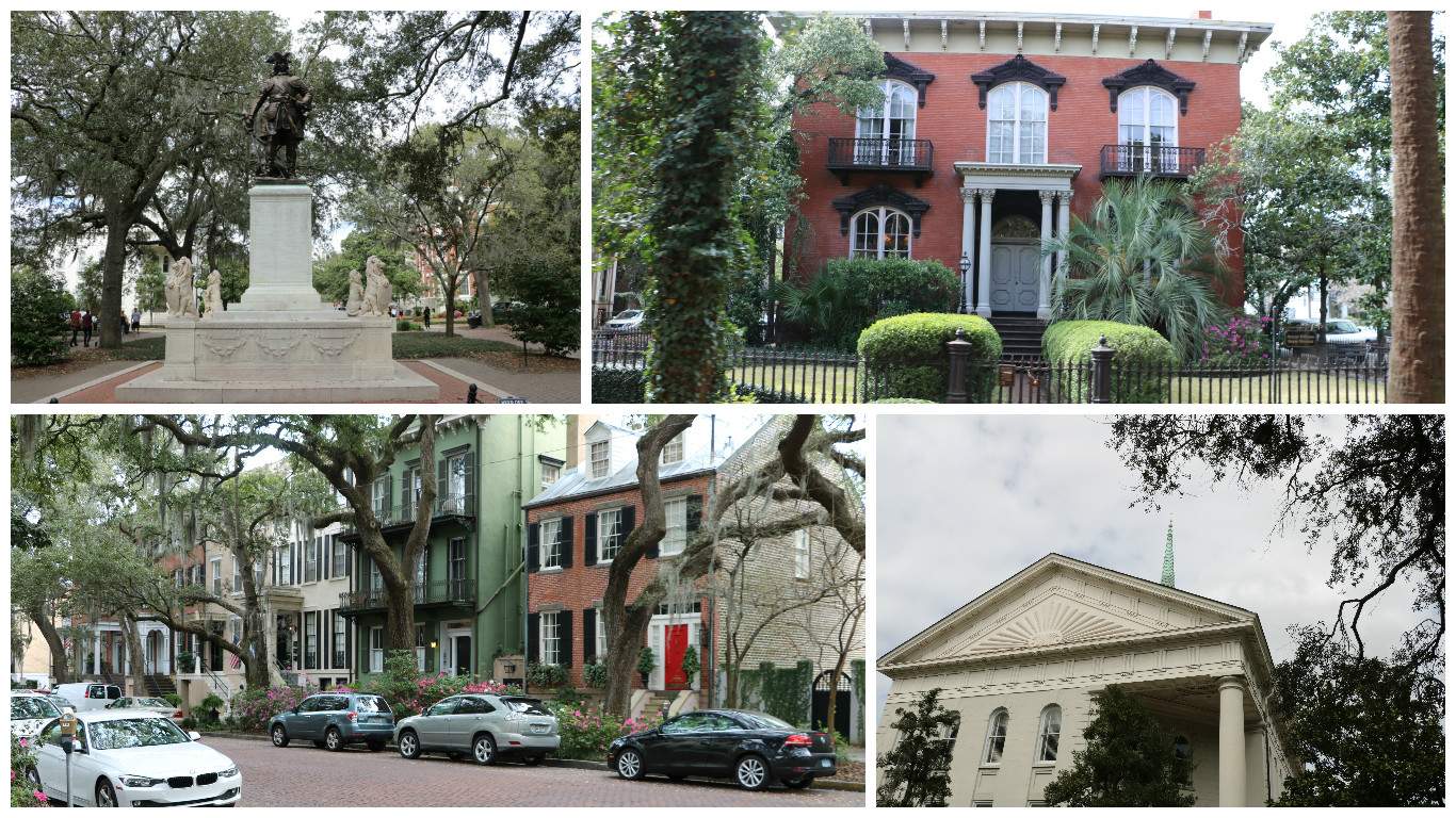 We hopped on and off the Trolley several times during the day as we took in the sights. A unique characteristic of Savannah is that the city was planned and built around squares of green space. Today there are 22 of them and two are “lost”. Each square is named for someone or some important historical event. Many of the squares we saw had a monument honoring someone other than the person the actual square was named for. In the upper left of the collage above is a statue of James Oglethorpe, founder of Georgia. However this tribute is in Chippewa Square, not in Oglethorpe Square. Chippewa Square is where Tom Hanks sat in the movie Forest Gump; the bench is now in the visitor’s center. In the photo on the lower right faintly shows the church steeple from which a feather floated down in the beginning of the movie.