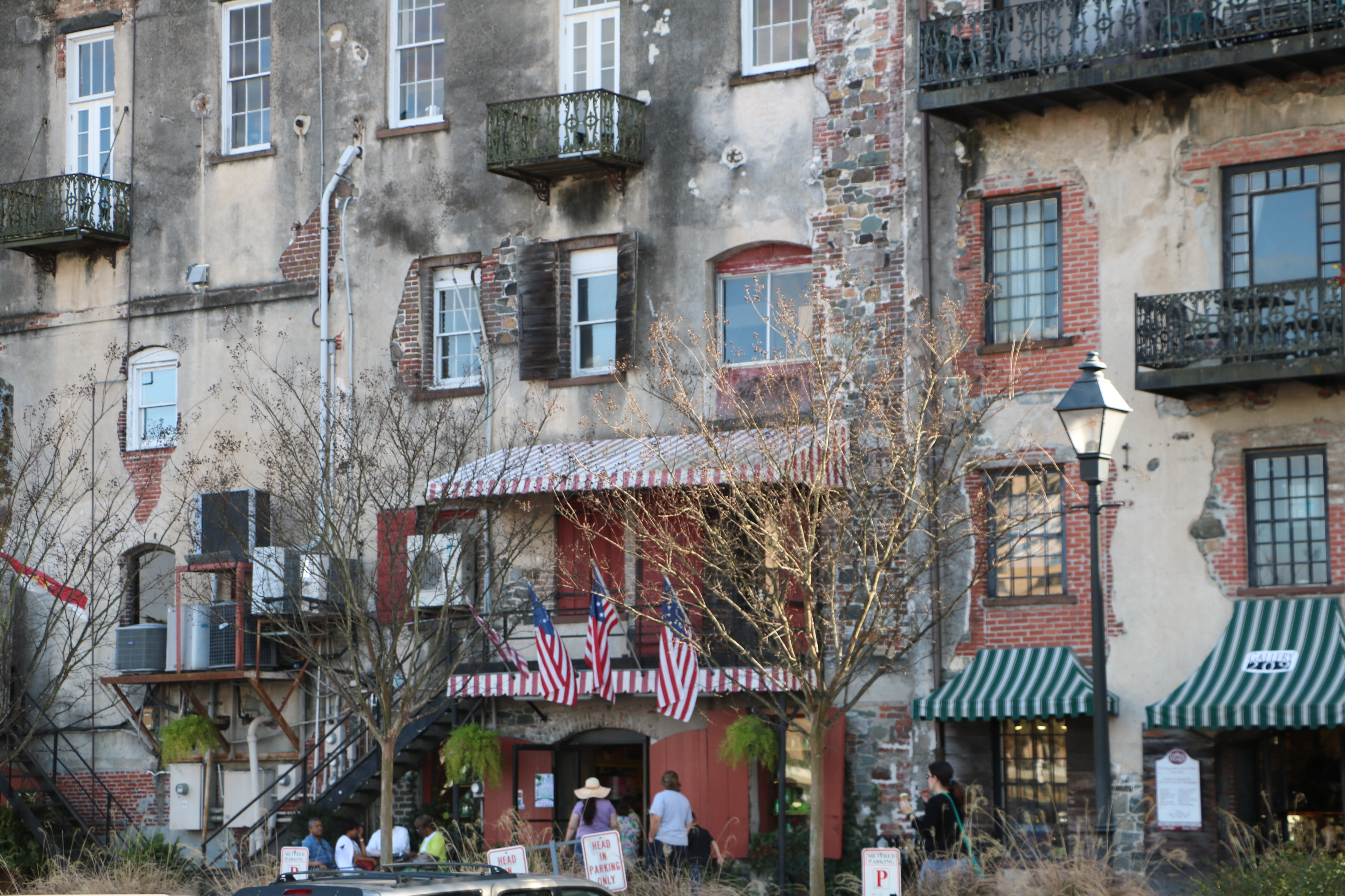 The trolley has a stop on the water front of the Savannah River. We appreciated the signs along the river-walk that told the history of the city. Along the street facing the river there are lots of fun looking shops and restaurants.