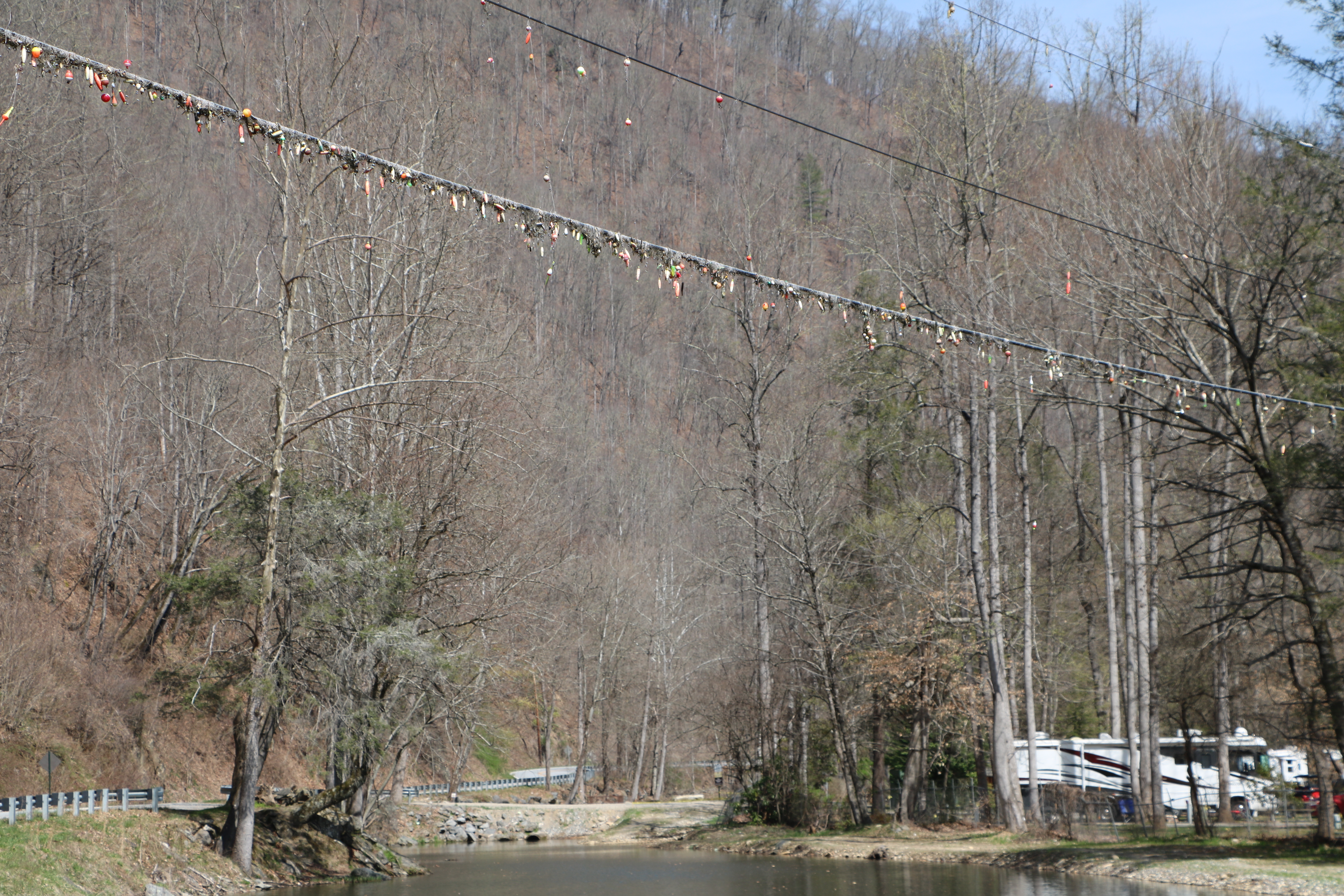 One thing that makes this park so special is besides having views of the Smokey Mountains from every angle, it is bordered on all sides by streams full of trout. These “ponds” are owned by the Cherokee Tribe and the required fishing license can be purchased in the KOA office. We got there on a Wednesday, just before opening day for the fishing season on Saturday. It’s hard to see in the photo above, but notice all the fishing lures caught on the wires.