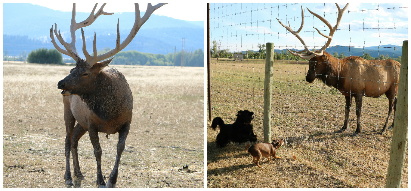 Jim has a niece that lives very close to Flathead Lake and raises elk. We got to see her property. Jim had brought a bag of apples to feed the elk, but one of them had already established his dominance over the rest of the herd. He came up to the fence while the others just looked longingly on. The two little dogs who live there couldn’t resist taunting him, and if the fence hadn’t been there, I’m sure he would have showed them who was boss.