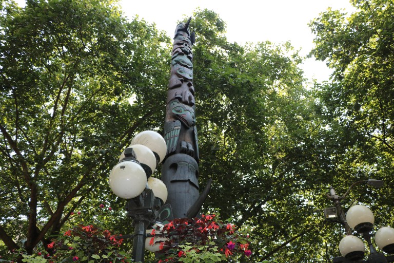 The totem pole in Pioneer Square has a colorful history. It is believed that it was stolen from Native Americans in Alaska and brought to Seattle by 15 businessmen in 1897.