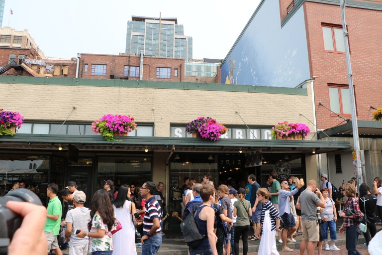 People were crammed inside and out of the Pike Place Starbucks store which was their first location, opened in 1971.