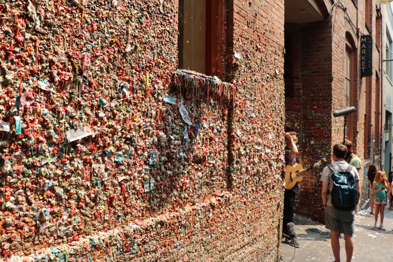 I found it gross, but a big tourist draw is the Market Theater Gum Wall. It’s in a passageway called Post Alley which is just left of the big neon Public Market sign. It started in the 1990’s when patrons in line for the improv theater parked their gum on the brick building wall.