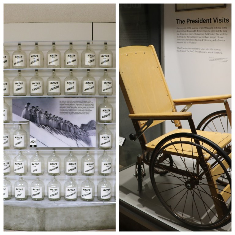 A couple of things caught my fancy. In 1951, beauty queens poured water from all 48 states, the territories of Alaska and Hawaii, and the Washington D.C. into the dam waters. It symbolized how every state had, in some way, contributed to the building of the dam. The photo above right, was a wheel chair that FDR used when he visited the dam. (In our travels we have seen several wheel chairs that FDR used on display in museums and national parks – seems that he really got around.)
