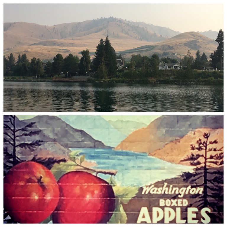 Chelan is a vacation destination on a small lake surrounded by apple orchards. Above is a view of the lake and below that was a mural painted on a building in town. We stayed in the campground at Lake Chelan State Park. It got great reviews on line but we weren’t too impressed. The grassy sites were tight, the electrical power to our RV and others around us kept going out, and it was noisy and chaotic. It was here that we noticed hazy smoke from forest fires. For the rest of the summer the smoke followed us around.