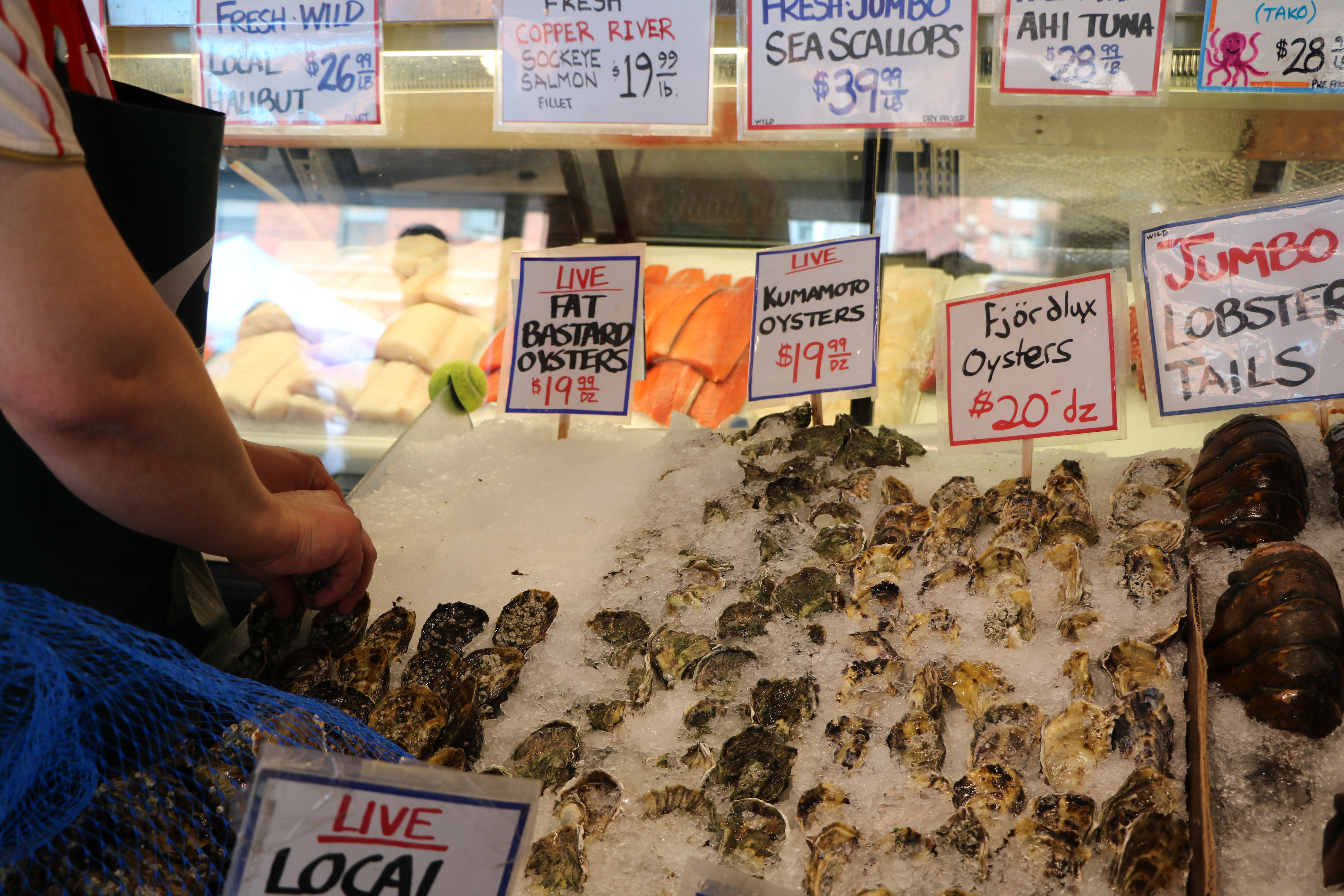 One of the busiest stalls was the Pike Place Fish Market where purchased fish is thrown back and forth between the employees before it is wrapped up.