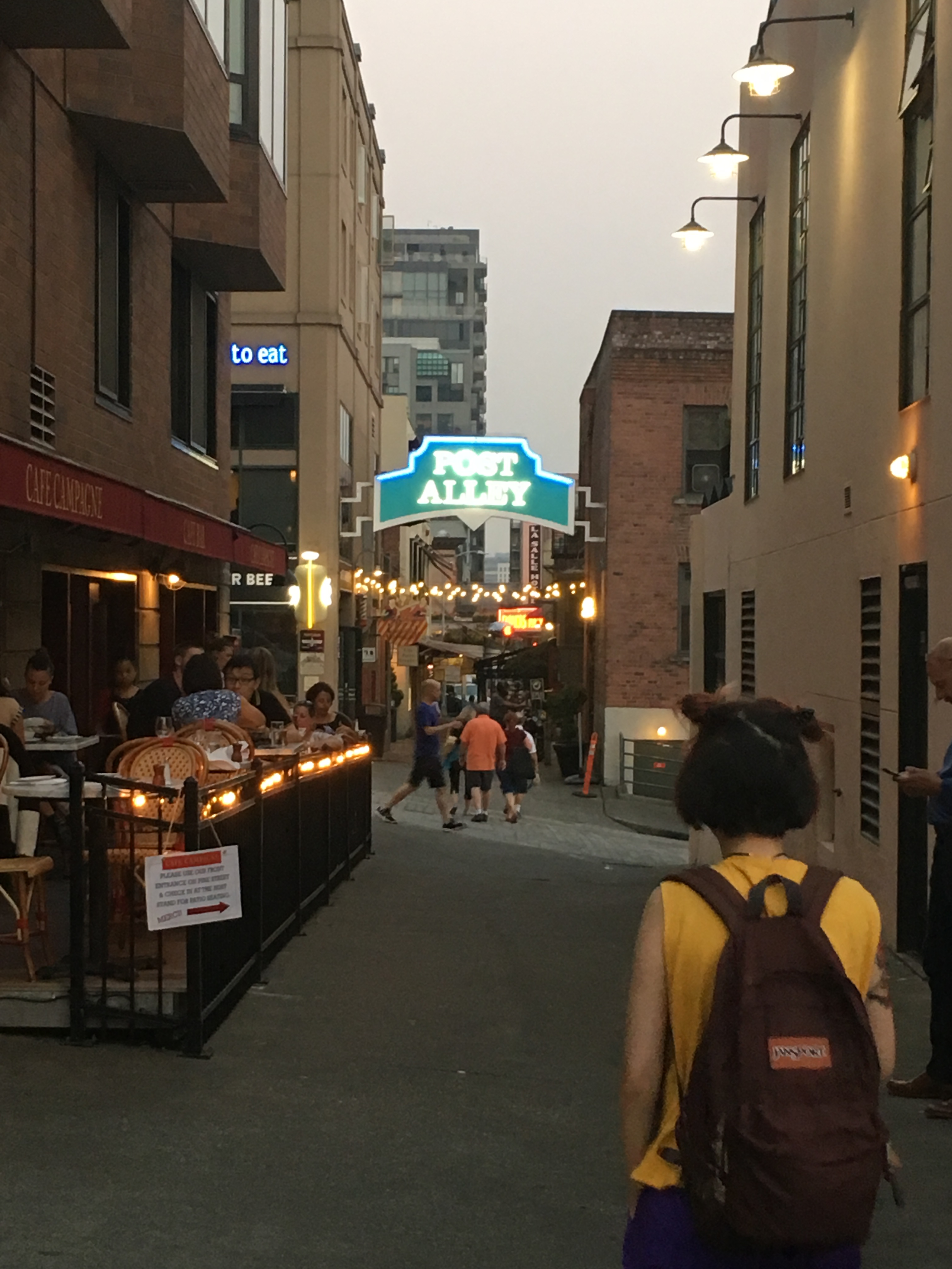 At night Post Alley looks like a different place – restaurants open up including one called The Pink Door, which we found enchanting. It’s not marked with a sign or anything – just a pink door. The inside is charming, the Italian – American food was divine and it’s known for its unique entertainment.