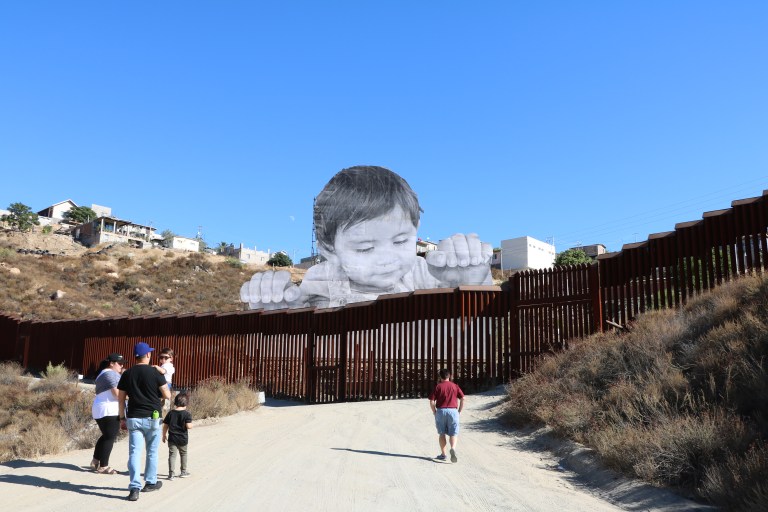 Our last stop of the day was to view a temporary art installation on the border wall at Tecate, California. Called “Kikito” it was erected by French artist JR and was about 65 feet tall. He took a photograph of an actual child in the town and achieved his goal of having a toddler look like he was peering over the wall just like the bars of a crib.