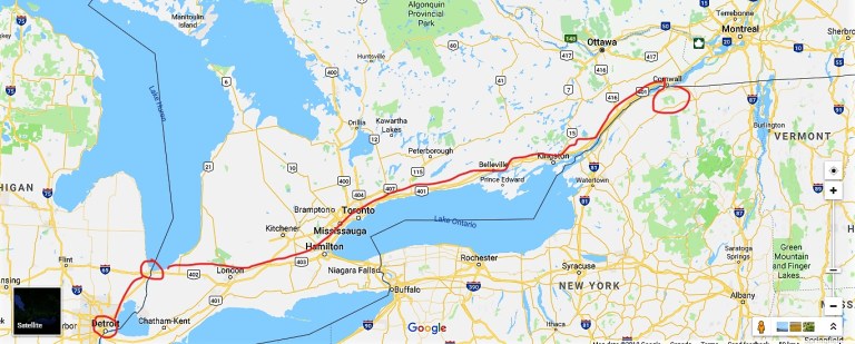 The next day we headed north to Port Huron and entered into Canada. We went east past Toronto (worst traffic ever, even though we were on a major highway – 401 – and it was seven o’clock at night) and stopped for the night in a Walmart. Then we headed east again. We kept going into Quebec and didn’t enter back in the US until Salaberry-de-Valleyfield which is not too far west of Montreal. We realized later that we passed at least a couple of border crossings such as Massena, New York and Cornwall, Canada. Gotta love GPS, but I did enjoy seeing all the signs in French and some really beautiful cottages along the St. Lawrence Seaway.