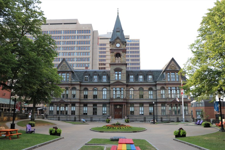 Right across from the length of the square is the Halifax City Hall . The original plans called for a city hall to be there, but instead the first building of Dalhousie University was built in the spot. By 1888, the area was considered to be in disrepair and city planners razed the university building and erected the city hall.