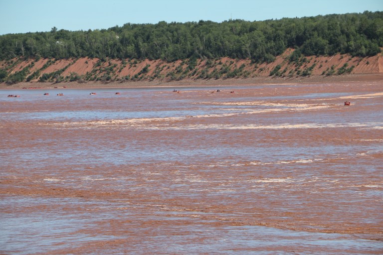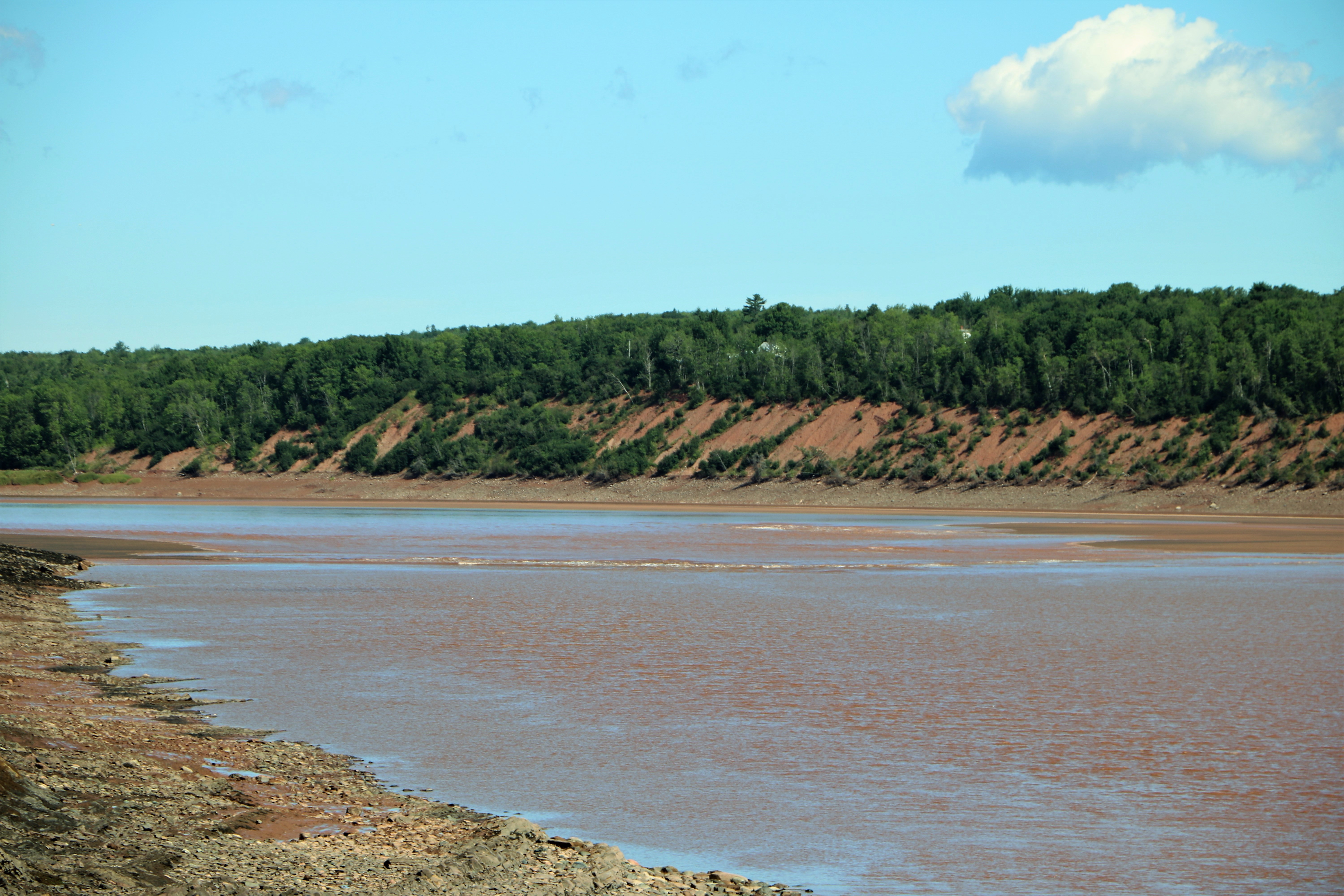 The muddy red clay of the Bay of Fundy made the water in the river look like watery chocolate milk.