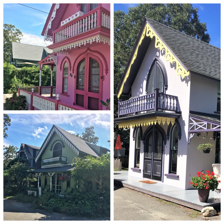 The first place we rode by was the Martha’s Vineyard Camp Meeting Association. This enclave of colorful gingerbread cottages is a big contrast to all the rest of the gray shingled and white fenced buildings on the island. Where each cottage stands there used to be a tent as part of the early 1800’s Wesleyan Church campground. Families eventually owned the tents and later erected the charming little houses. Today the neighborhood has no religious ties and the properties are passed to down from generation to generation.