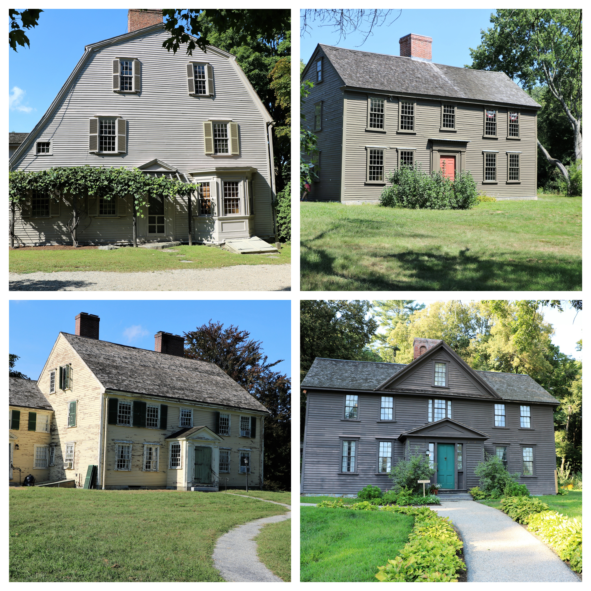 Along Battlefield Road, the route the British took from Lexington to Concord, there were several historic houses. Going clockwise from the top right: Jacob Whittemore House built in 1717; Orchard House where Louisa May Alcott wrote the book Little Women; Major John Buttrick House built in 1715 and owned by the man who gave the order to fire on the British at the North Bridge; The Old Manse built in 1770 and lived in by both Ralph Waldo Emerson and Nathaniel Hawthorne.