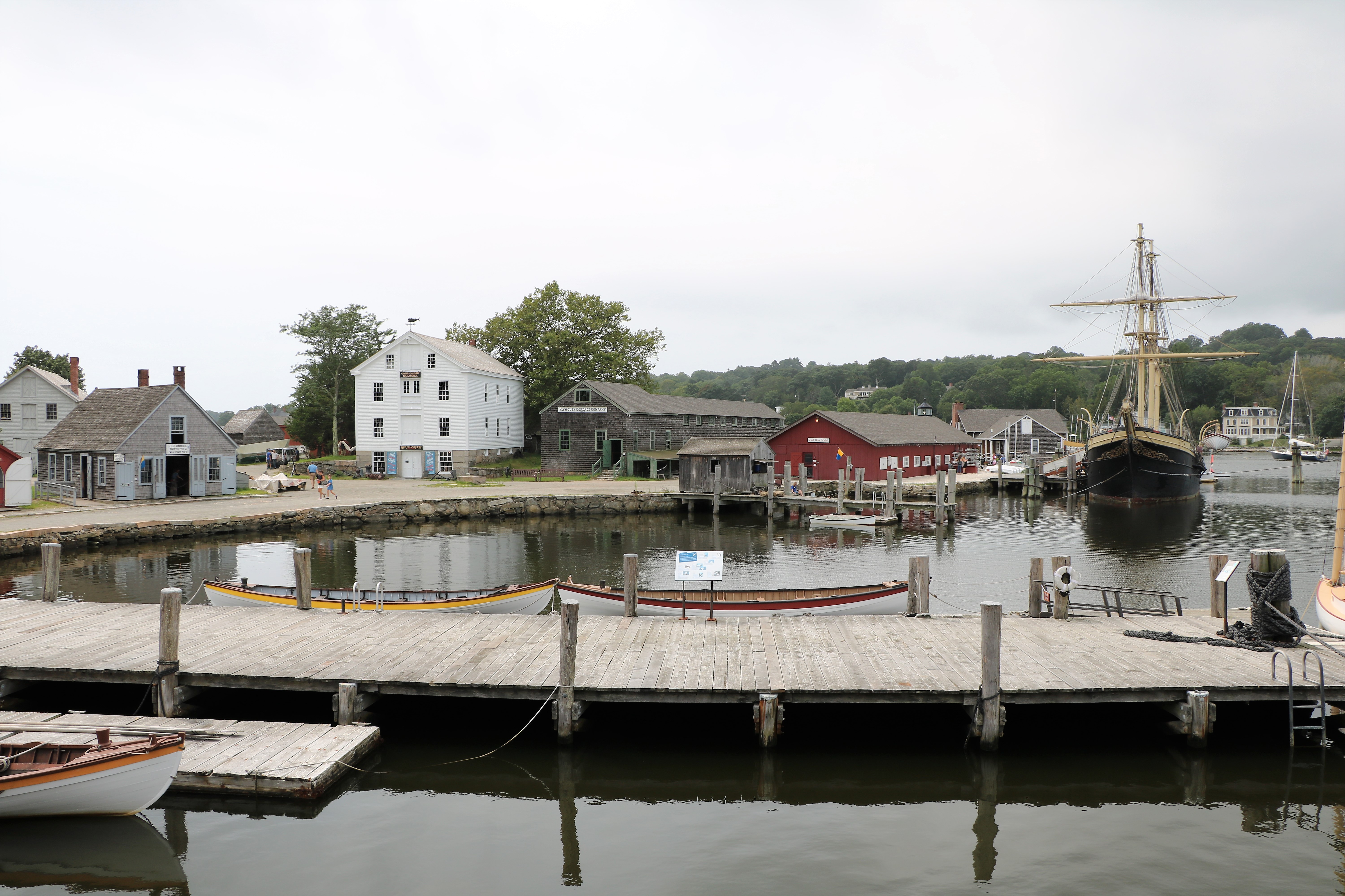 The ship above is Mayflower II, a replica of the original Mayflower that the Pilgrims sailed on. It was built in 1956 and usually is on display in Plymouth, Massachusetts as part of the museum, Plimoth Plantation. It was at the Mystic Seaport Museum being restored in their working shipyard.